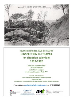 Nous avons le plaisir de vous annoncer la prochaine journée d’études de l’AEHIT (Association pour l’Étude de l’Histoire de l’Inspection du Travail), le 1er décembre 2025, dédiée à l’inspection du travail en situation coloniale.